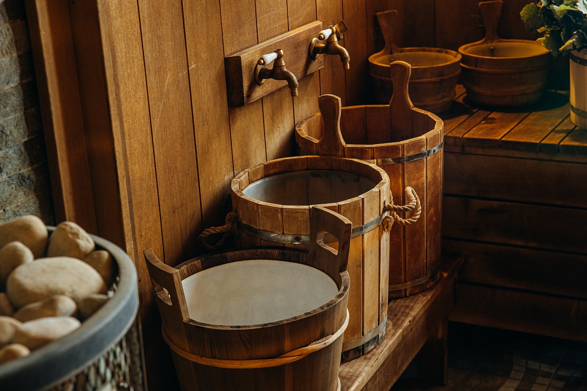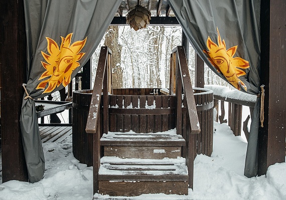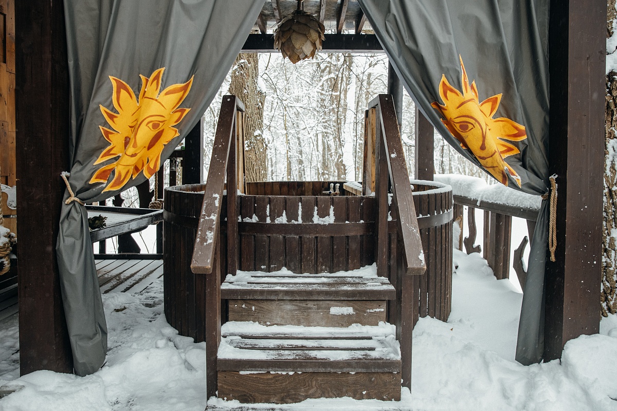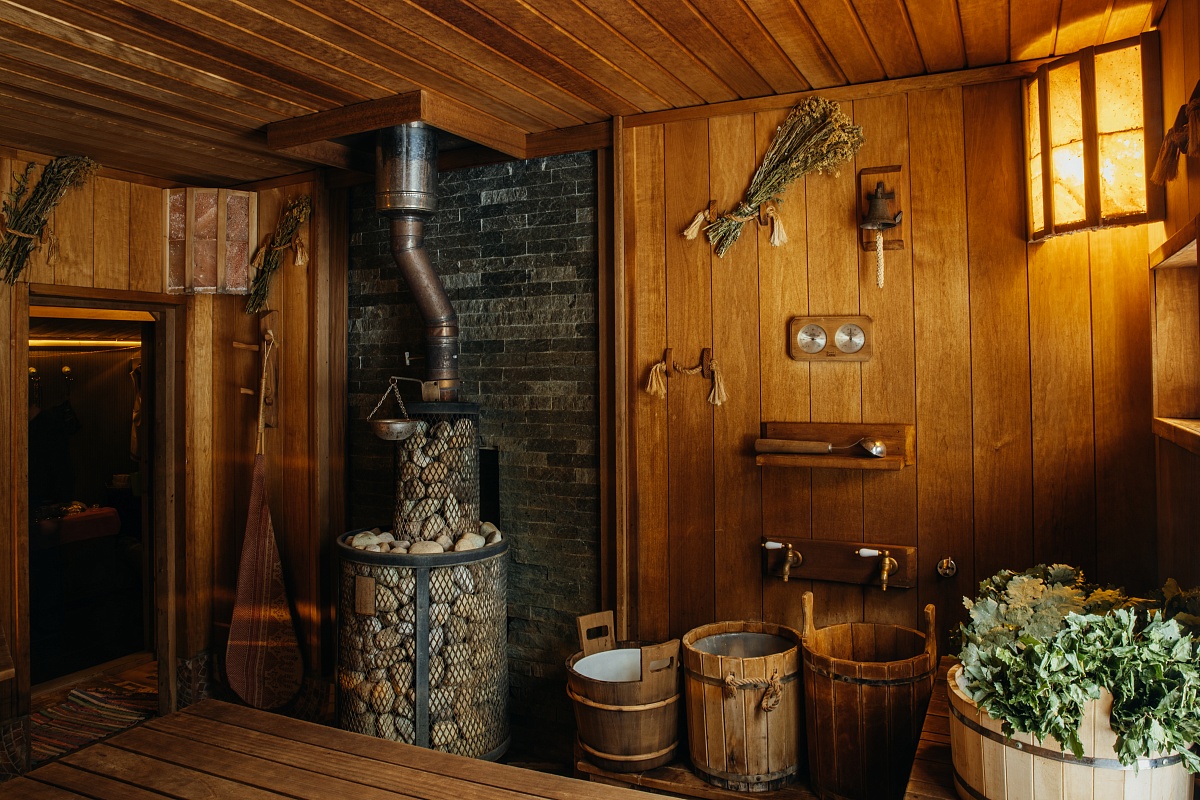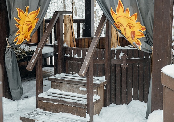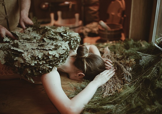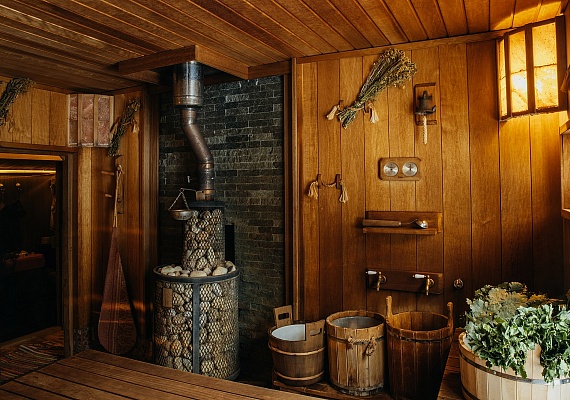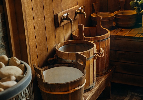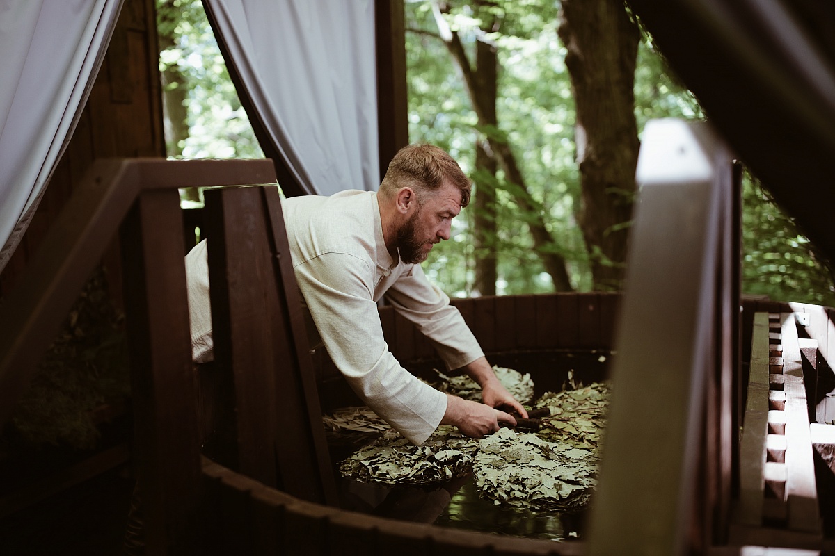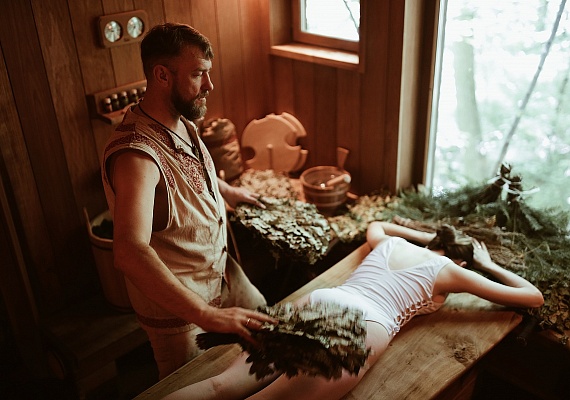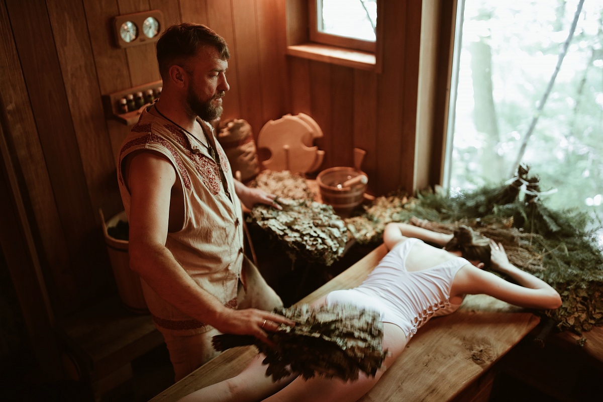 - Второй заход в парную: солевое выкатывание с травяным крошевом. Обмыв фитосоставом. Сочетание мягких и интенсивных техник парения с яркими припарками тремя видами веников: дубовые, березовые, пихтовые. Контрастные процедуры — прохладный/холодный душ, обливание холодной водой или купание в купели с родниковой водой.