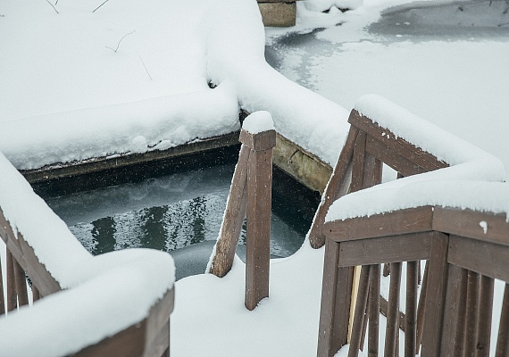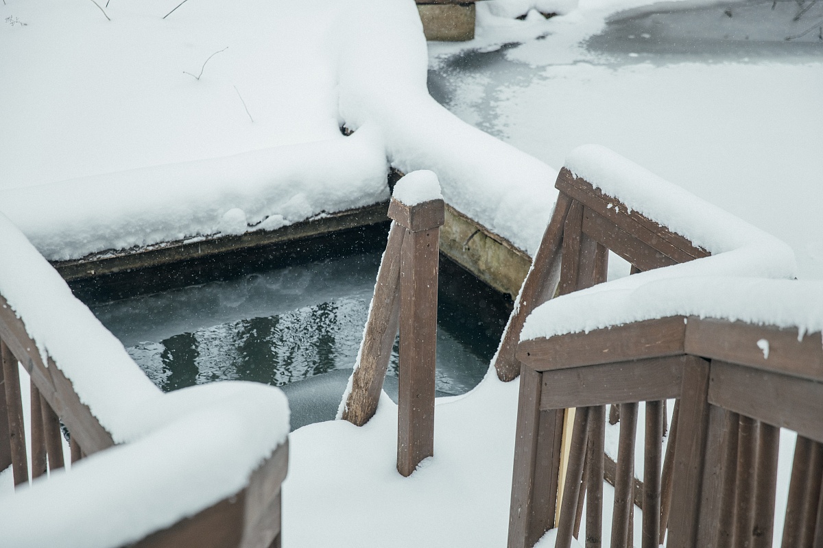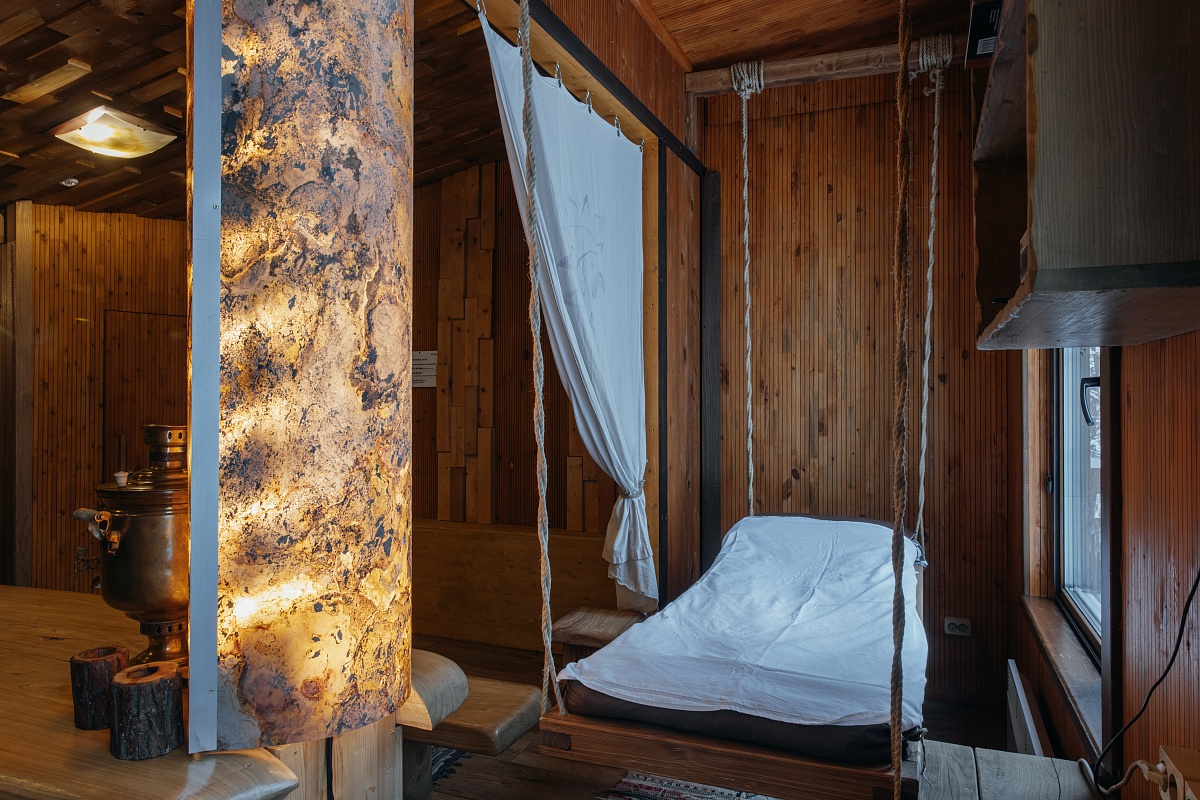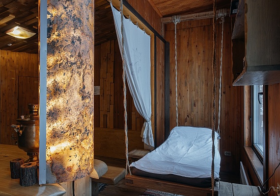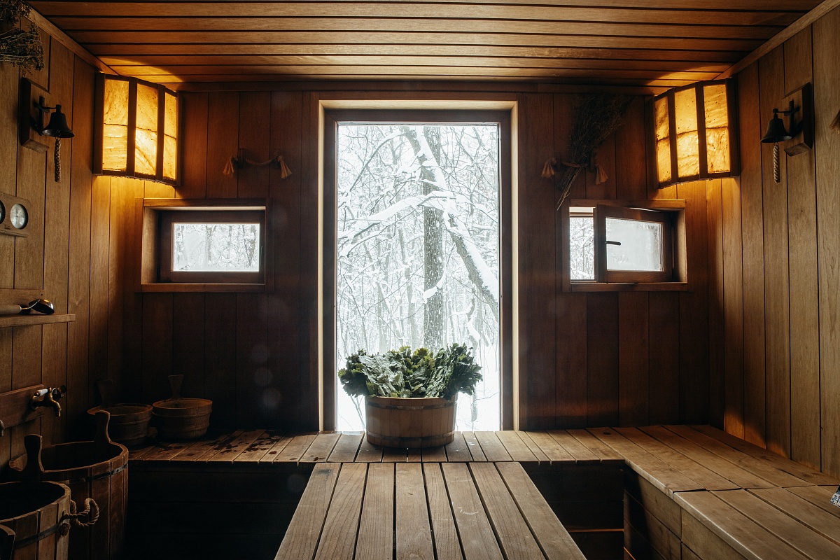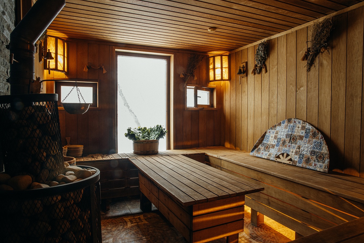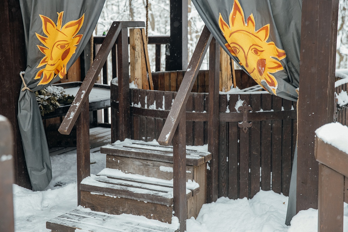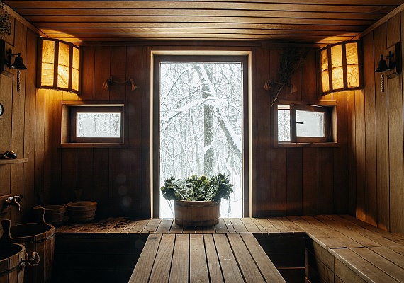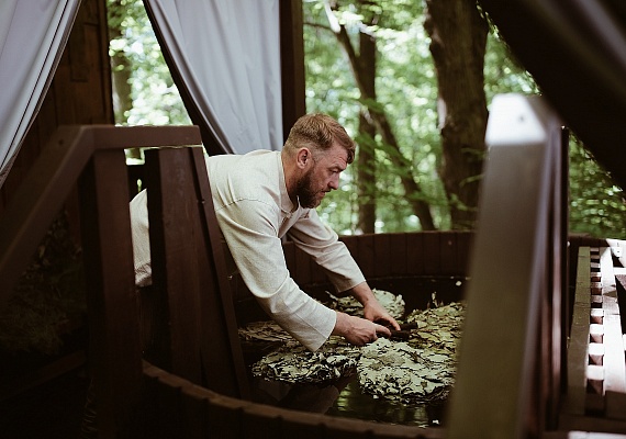 - Второй заход в парную: солевое выкатывание с травяным крошевом. Обмыв фитосоставом. Сочетание мягких и интенсивных техник парения с яркими припарками тремя видами веников: дубовые, березовые, пихтовые. Контрастные процедуры — прохладный/холодный душ, обливание холодной водой или купание в купели с родниковой водой.