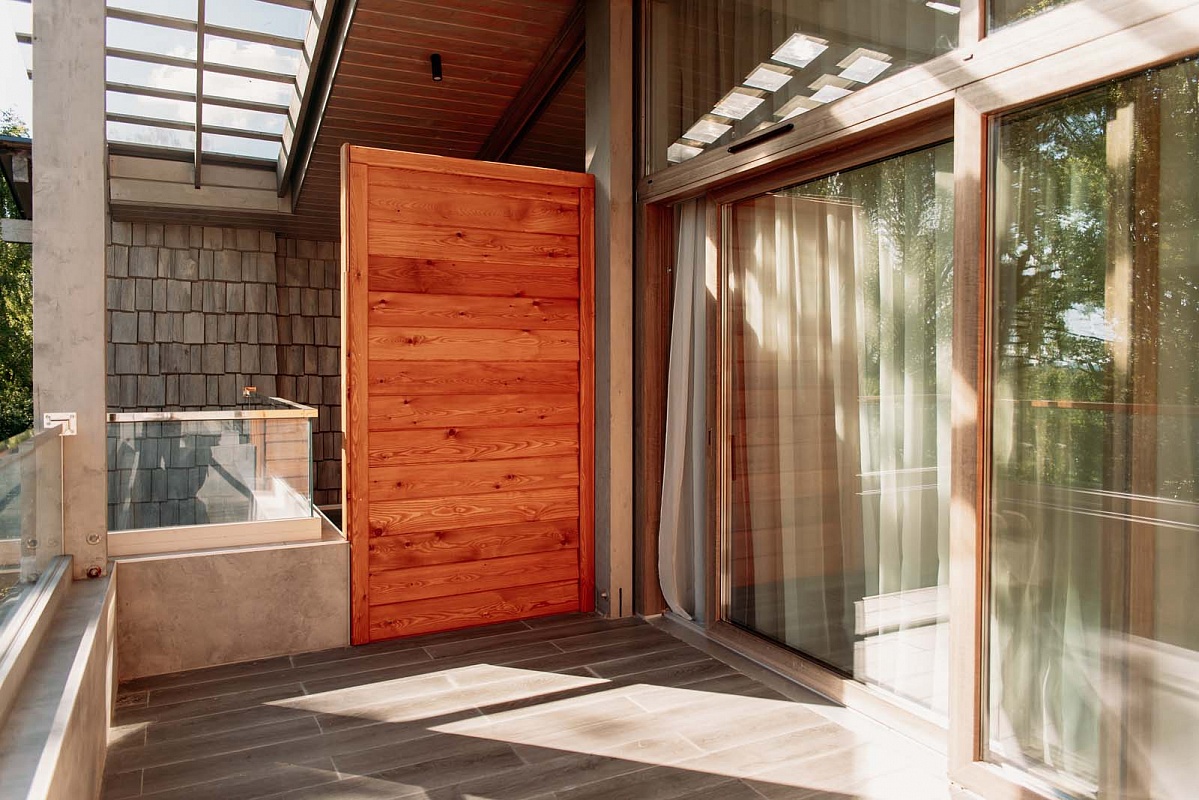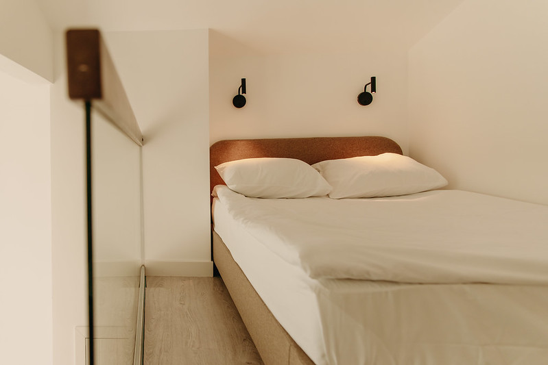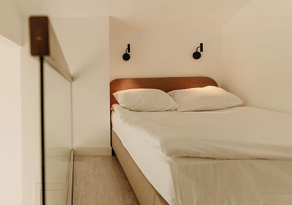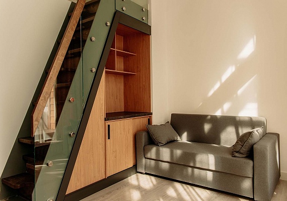 Уютный однокомнатный, но двухуровневый номер с просторной двуспальной кроватью на мансарде с ортопедическим матрасом и раскладывающийся диван в гостиной комнате. Номер имеет выход на открытую террасу с завораживающим видом на лесную зону.