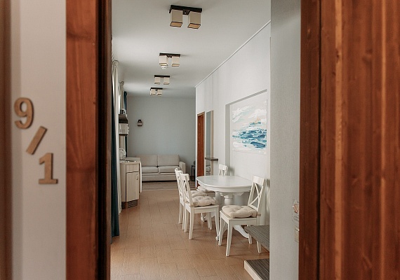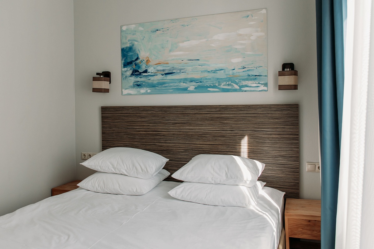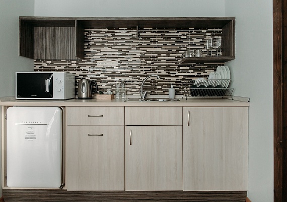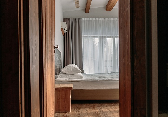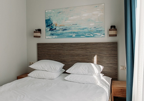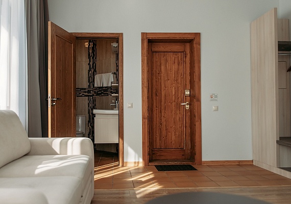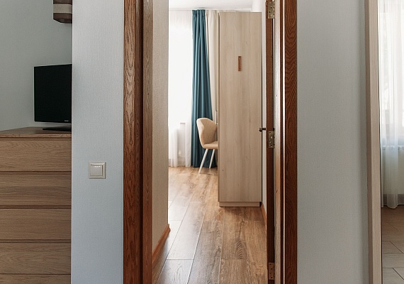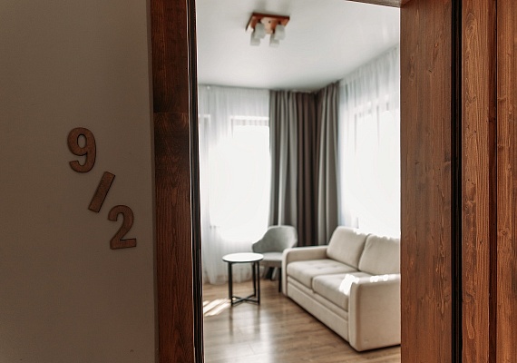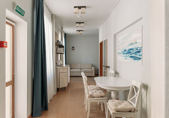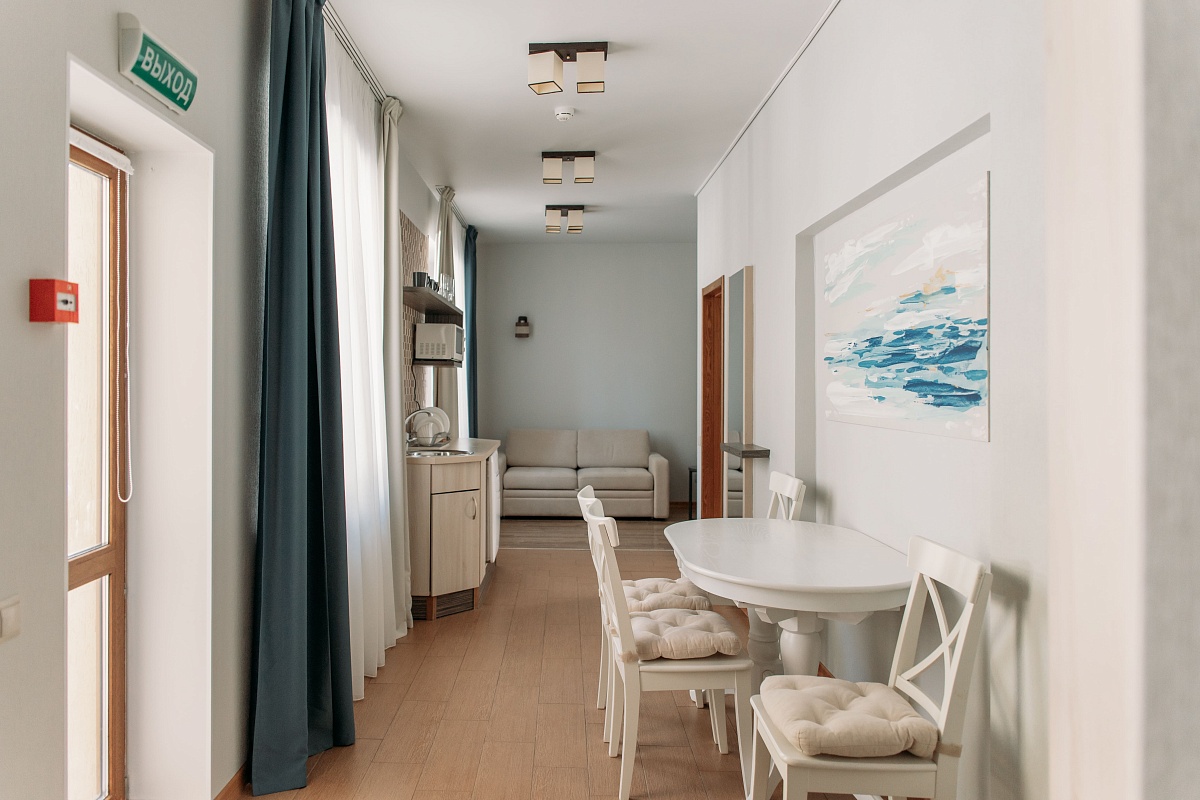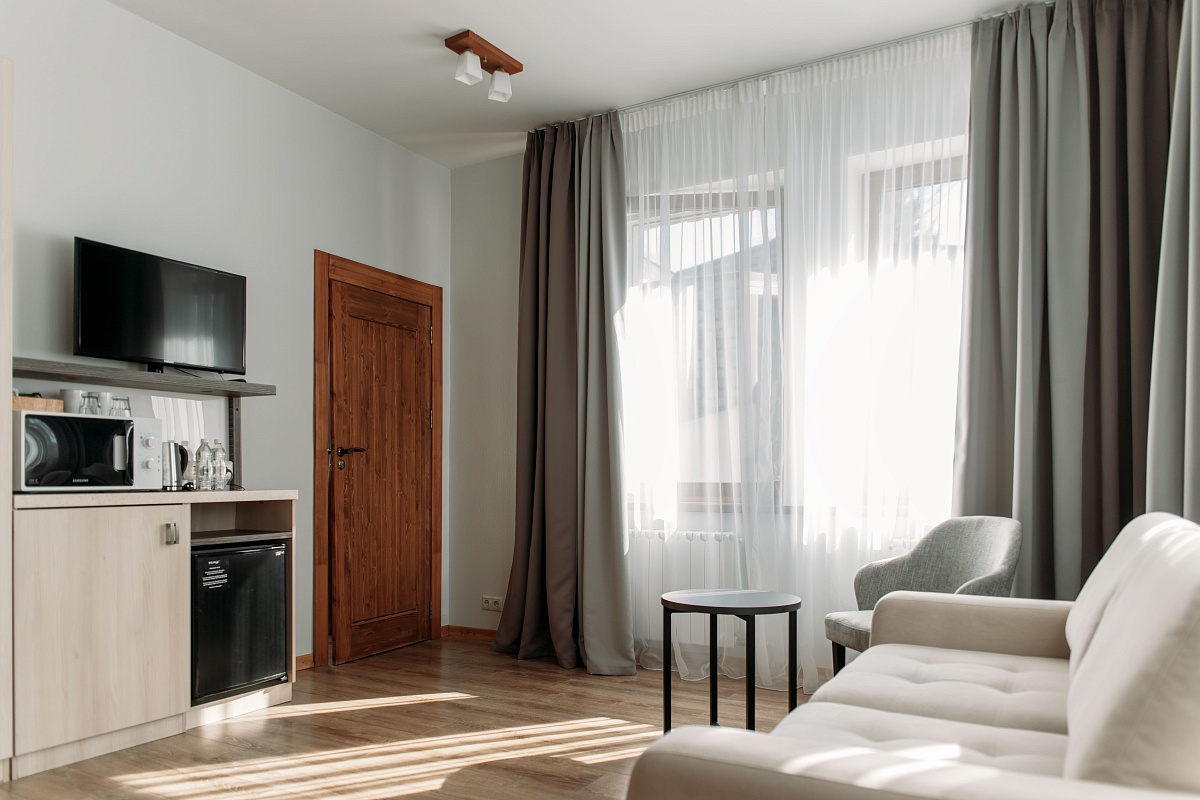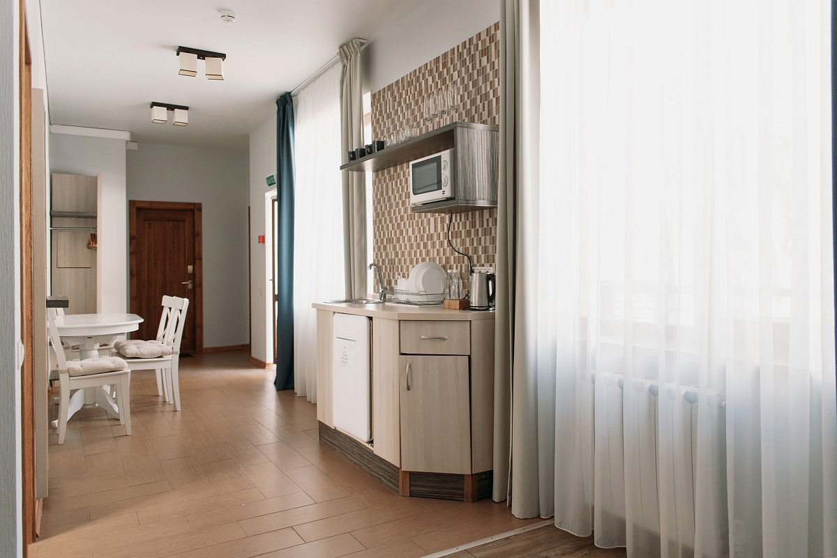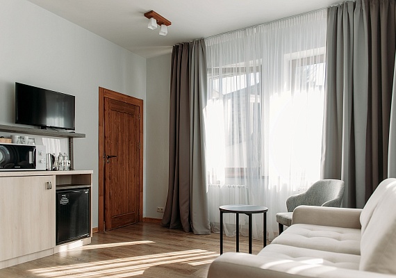 Просторный и комфортный номер — отсюда открывается прекрасный вид на территорию отеля. В каждом номере есть гостиная-столовая с диваном, спальня с большой и удобной кроватью, а также мини-кухня. Оформление интерьера может отличаться от фотографий сайта!
