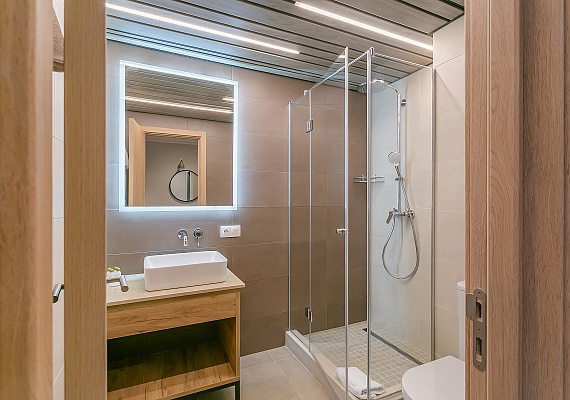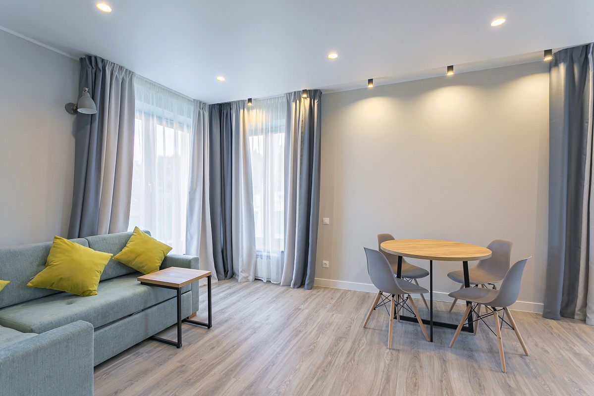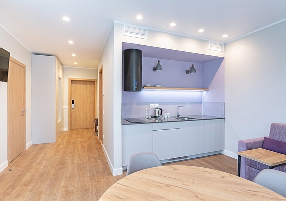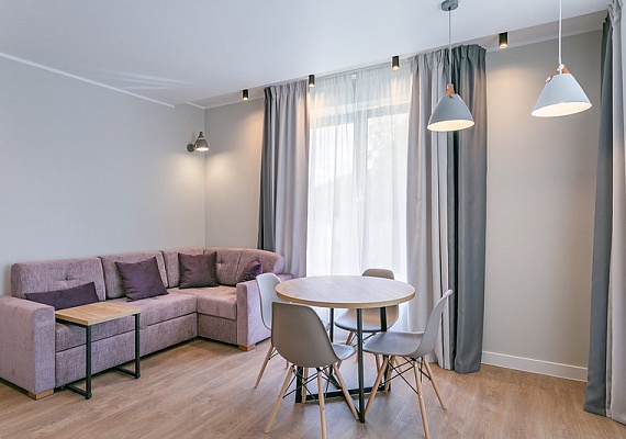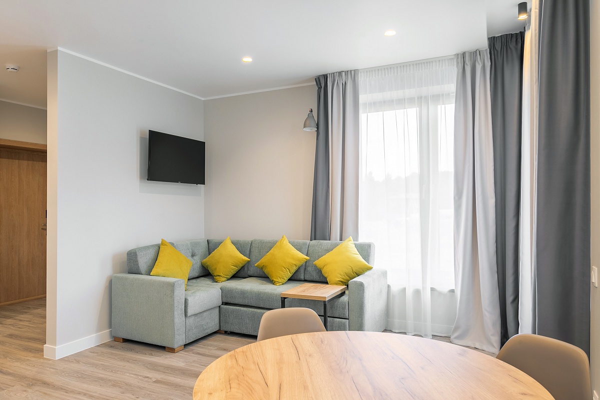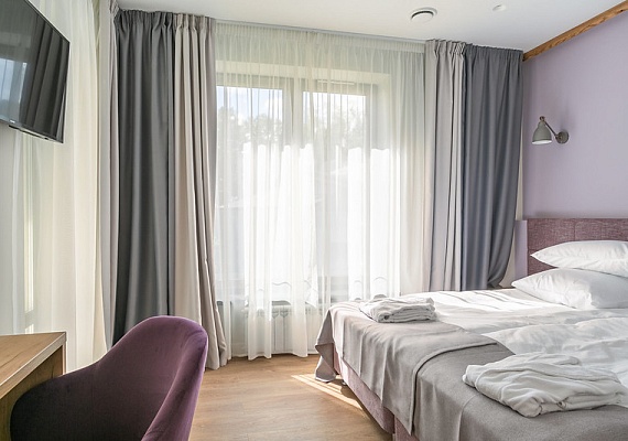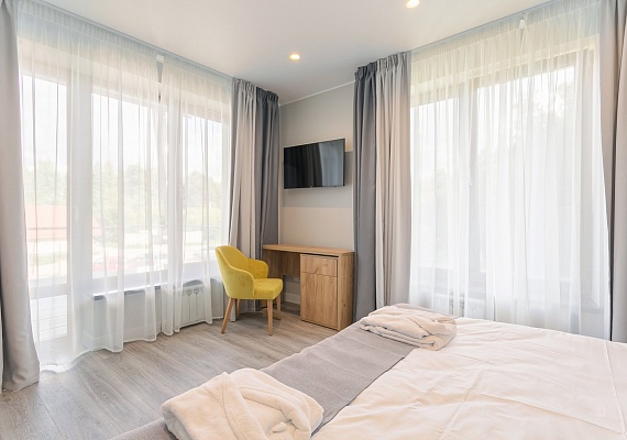 Двухкомнатный номер с гостиной и кухонной зоной. Индукционная плита на две конфорки, набор посуды, электрический чайник и мягкий раскладной диван и круглый стол с удобными стульями. В номере также большая и уютная веранда с видом на зеленную и территорию отеля. Оформление интерьера может отличаться от фотографий сайта!