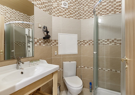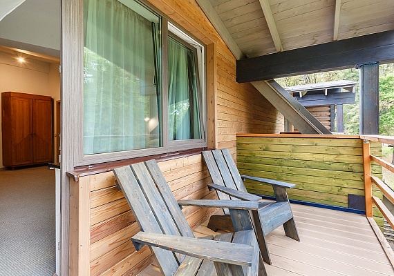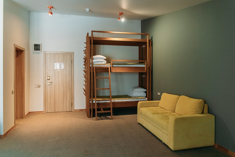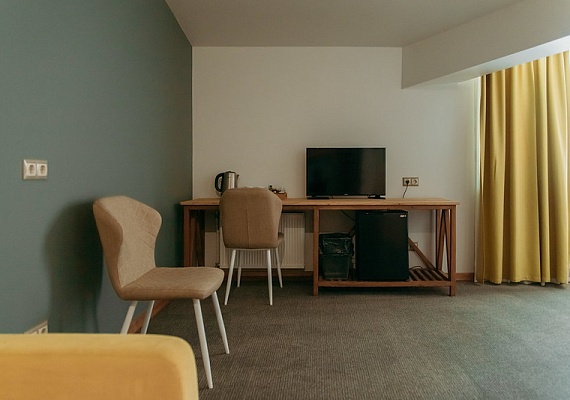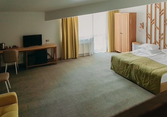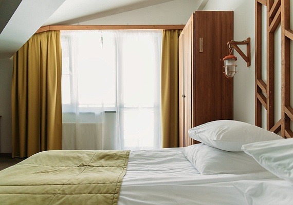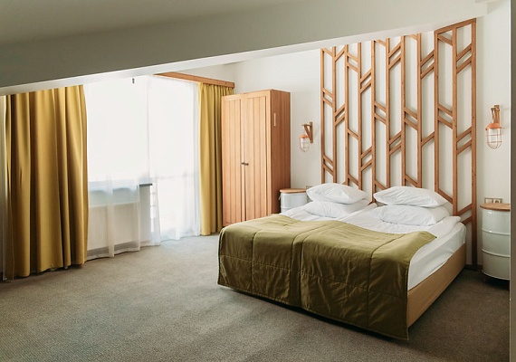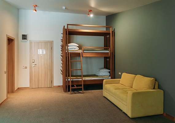 Стандартный номер с увеличенной площадью. В каждом номере большая удобная двуспальная, либо две раздельные кровати, большой диван и двухъярусная кровать. Благодаря разделению единого помещения на две зоны — в номере могут с удобством расположиться пять человек. Этот вариант прекрасно подойдет для большой семьи. Оформление интерьера может отличаться от фотографий сайта!