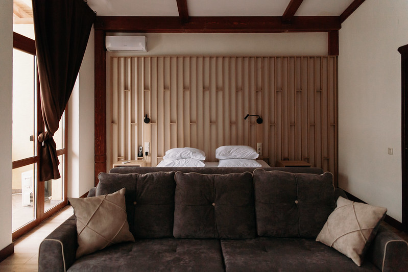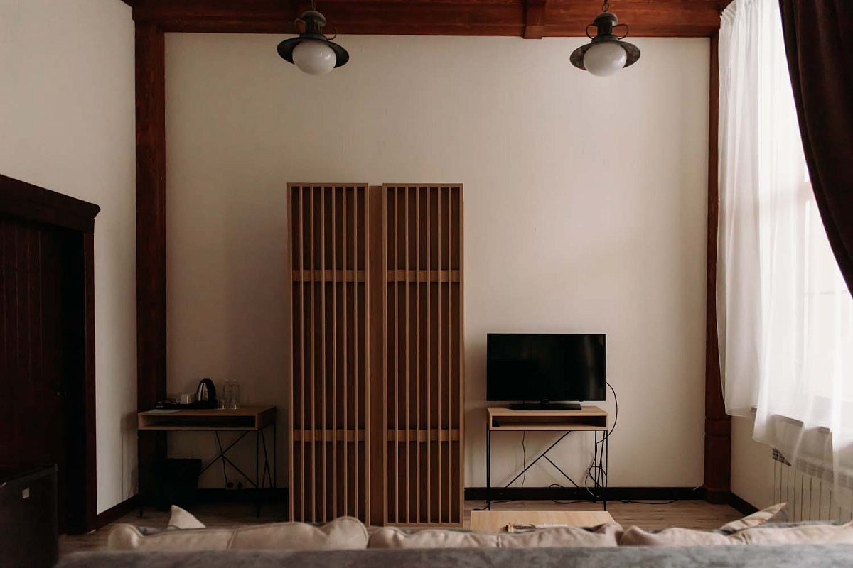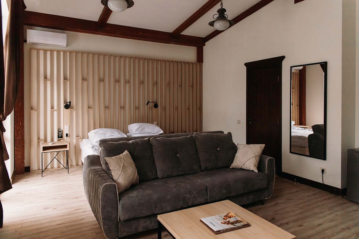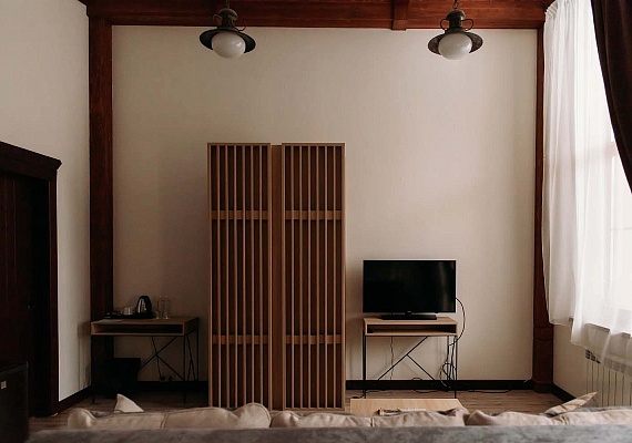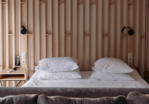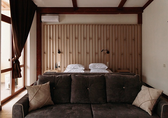 Просторный светлый однокомнатный номер с одной двуспальной кроватью или двумя раздельными. Большие окна выходят на солнечную сторону, а с балкона, обустроенного уютными плетеными креслами и небольшим столиком, открывается вид на лес. Оформление интерьера может отличаться от фотографий сайта!