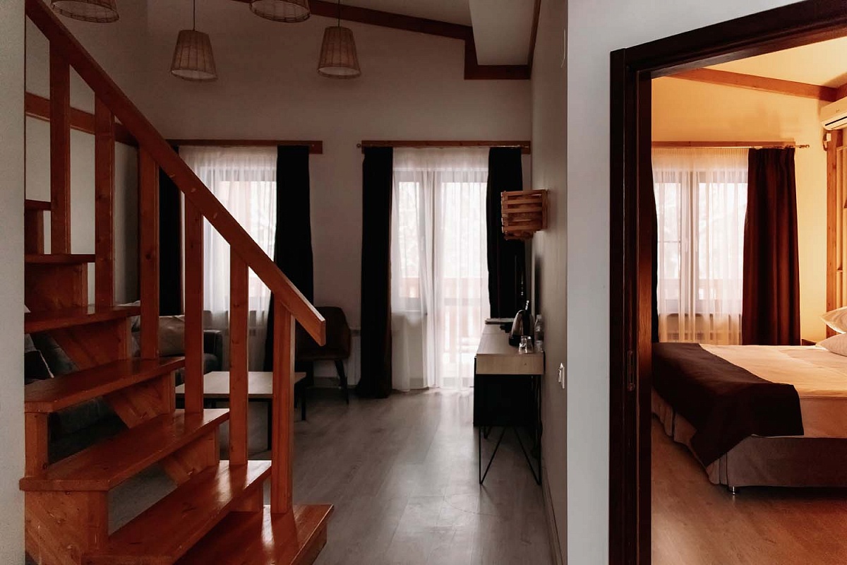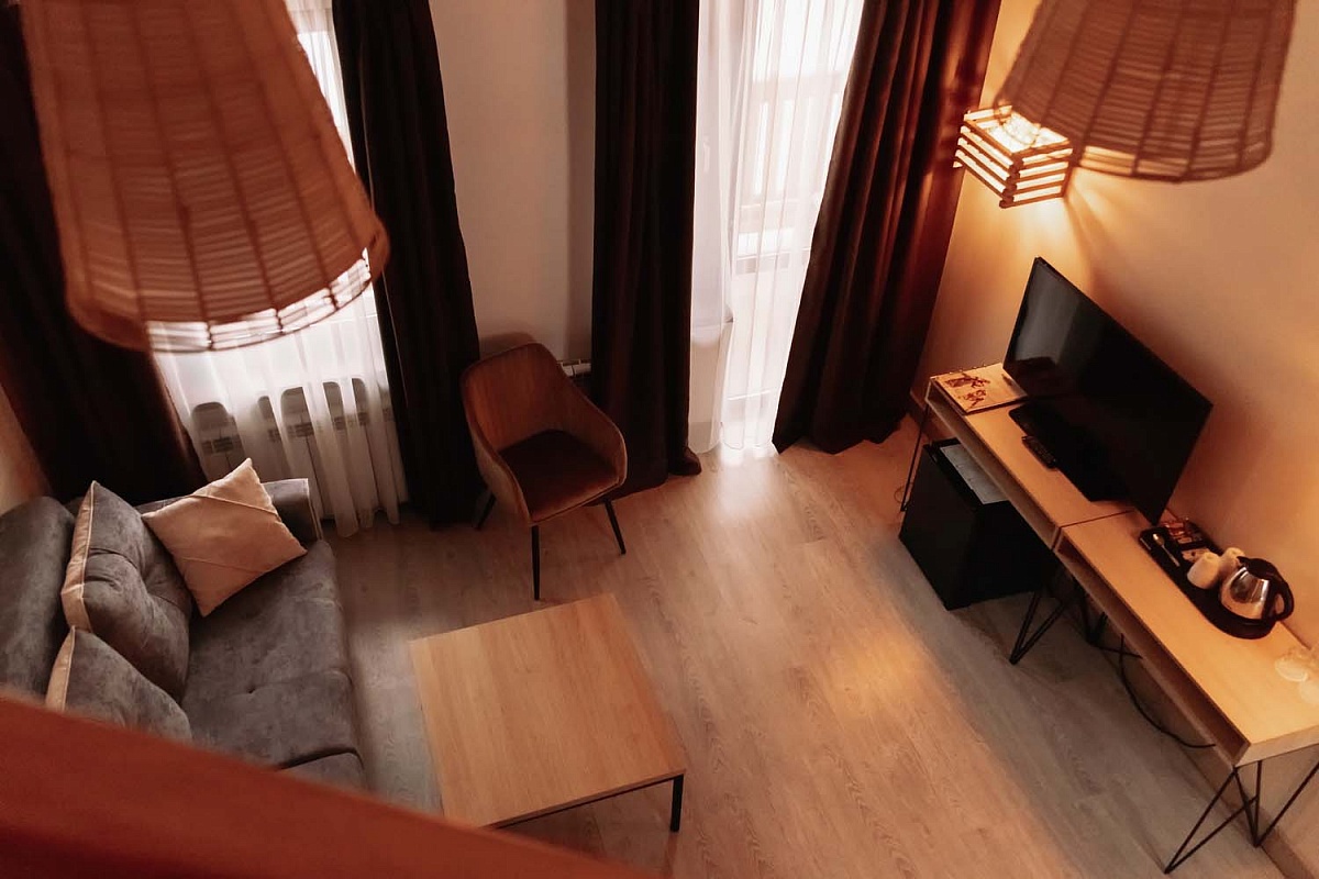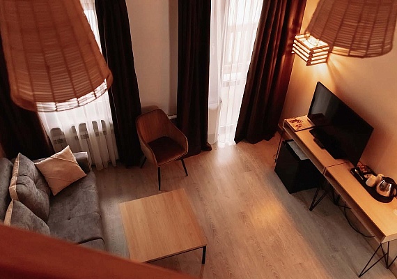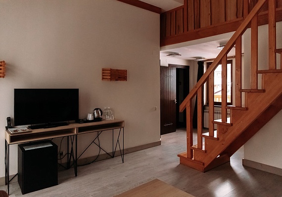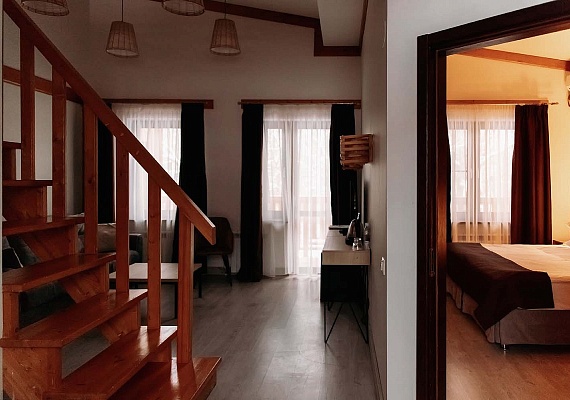 Двухкомнатный номер со спальней и одной двуспальной кроватью или двумя раздельными а также уютная гостиной с раскладным диваном. Каждый номер имеет выход на открытую террасу с живописным видом. Корпус расположен в самом сердце отеля. Оформление интерьера может отличаться от фотографий сайта!